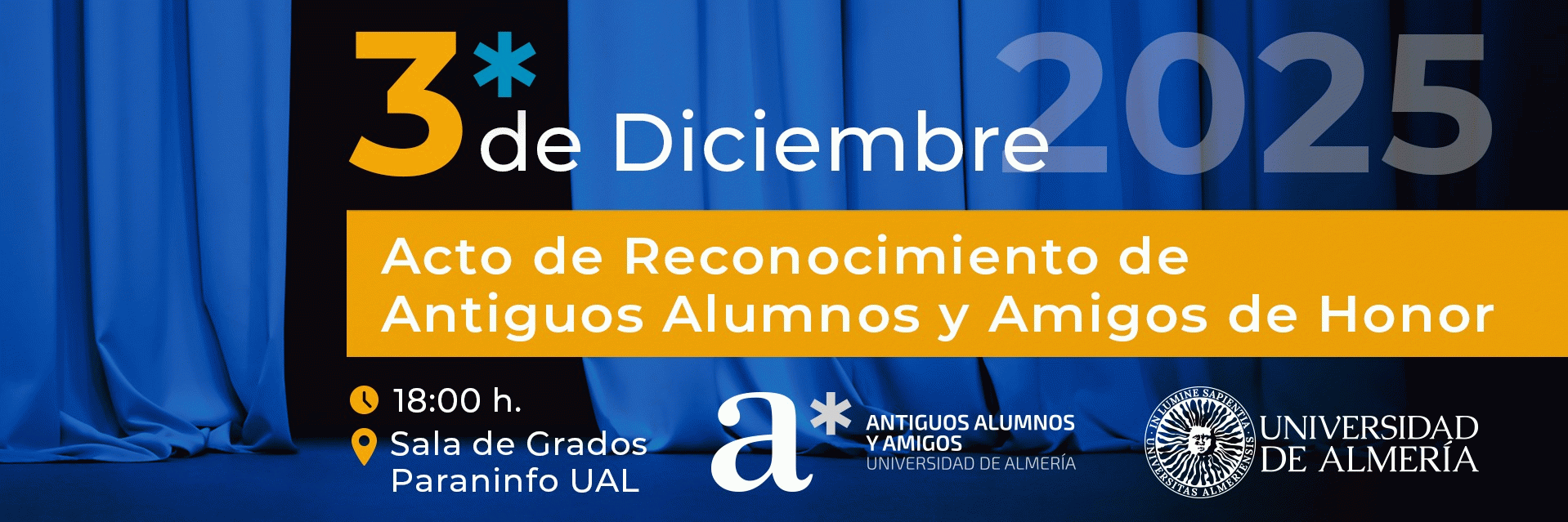 VII Acto de Reconocimiento de Alumni, Entidad amiga y Amigo/a de Honor 2025. 3 de Diciembre de 2025 a las 18:00 horas en el Paraninfo de la Universidad de Almería. El objetivo de este acto es destacar el talento, la trayectoria profesional y el compromiso con la institución de antiguos alumnos, amigos de la universidad o entidades colaboradoras.